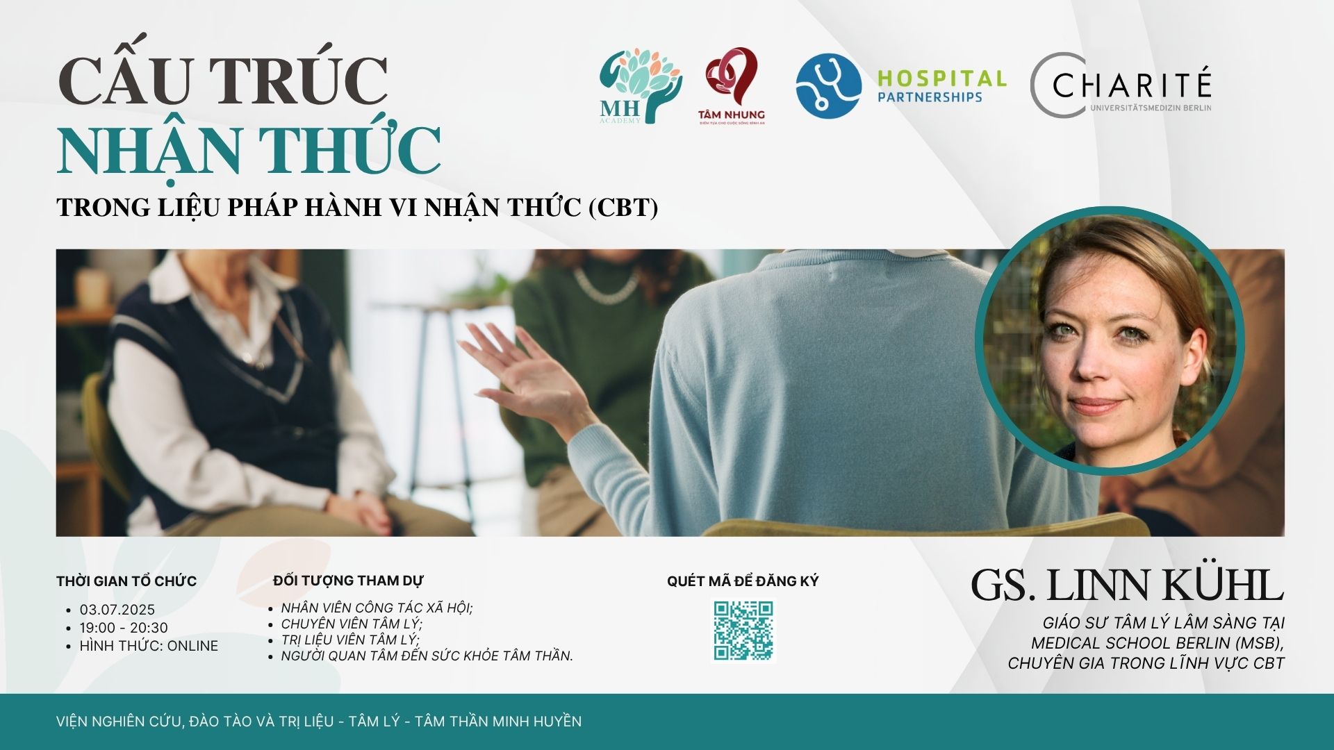 Diễn giả chính: GS. Linn Kühl – Giáo sư Tâm lý Lâm sàng tại Medical School Berlin (MSB), chuyên gia trong lĩnh vực CBT.